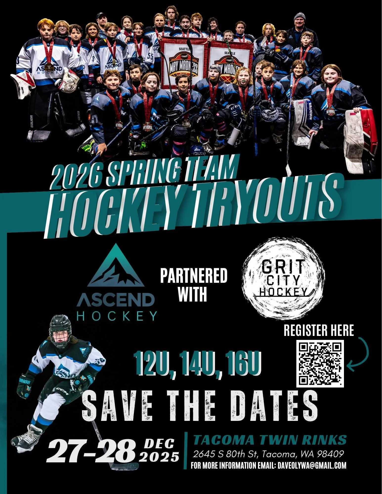 Tryouts for the upcoming spring teams will be held on December 27-28th 2025 at Tacoma Twin Rinks - 2645 S 80th St, Tacoma, WA 98409
